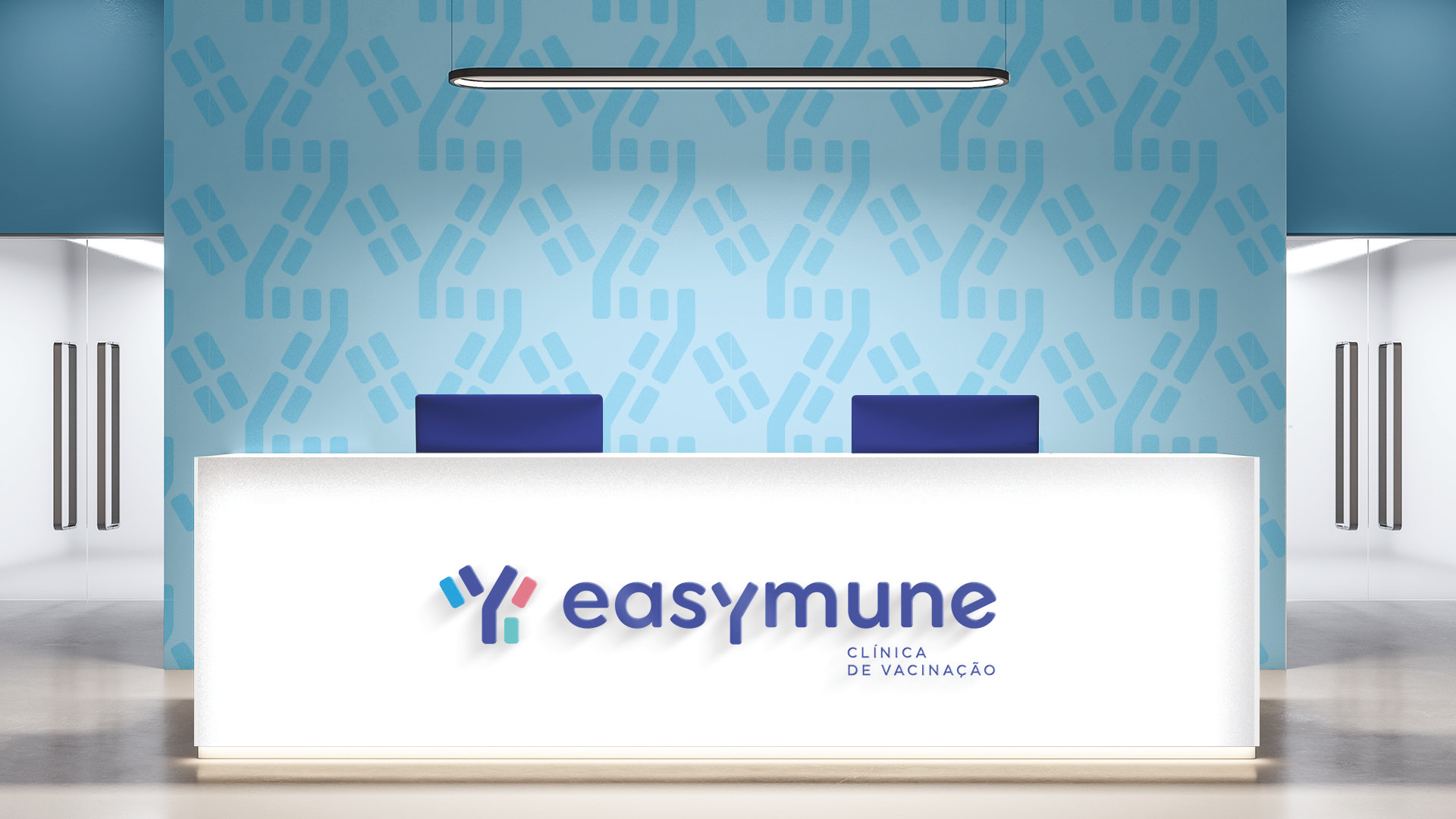 A identidade visual da Clínica de Vacinação Yeasymune foi desenvolvida a partir da síntese gráfica entre a estrutura de um anticorpo e a letra “Y”. O símbolo é uma estilização dessa forma biológica, traduzida em um elemento visual simples, reconhecível e diretamente associado a anticorpos, que reforça o posicionamento da clínica no universo da imunização.